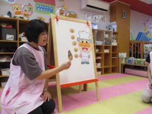 9/30に9月のお誕生日会をしました。【パン屋に5つのメロンパン】をアレンジして園の子どもたちを登場させました。