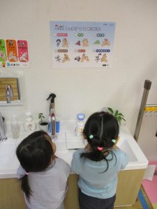 教えてもらった事を確認しながら手を洗っています。これからの季節、感染症対策にも大切な習慣ですのでご家庭でも一緒に行ってみて下さいね。