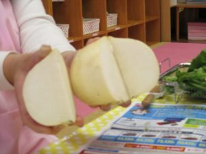 今月は給食にかぶがよくでます。旬野菜ですね。12月のピザクッキングもかぶを使います。